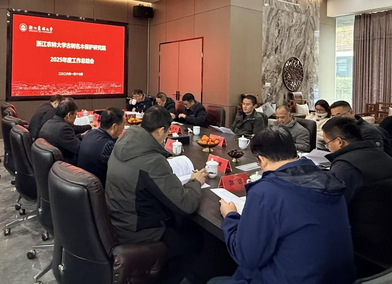 1月17日 ,beat365官方网站古树名木保护研究院召开2025年度工作总结会。会议全面回顾2025年度工作成效,部署2026年重点任务。浙江省林业局党组成员、总工程师沈国存,浙江省森林病虫害防治总站站长章滨森,研究院学术委员会委员、学校相关部门负责人及研究院各研究团队参加会议。会议由研究院副院长陈忠良主持。