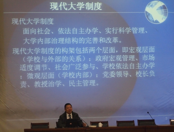 覃正教授从现代大学制度的内涵谈起,介绍了现代大学制度的宏观及微观构架,着重探讨了理事会制度、大学章程和大学“去行政化”等问题;并从大学招生和大学生培养这两个话题展开,对于“明天的竞争者,今天如何选拔、教育、培养”等发表看法,详细介绍了南方科技大学首创的招考方式,包括综合观察学生发现问题、分析问题和解决问题的能力,重点考察学生的记忆力、注意力、想象力、洞察力以及批判性思维能力等。在学生培养上,覃教授介绍了书院制,提倡改革课程体系。在谈到大学与未来时,覃教授提出大学未来将推行“微学位”制度,在大数据与移动交互平台基础上产生的“慕课”影响深远,将引领传统大学的发展。