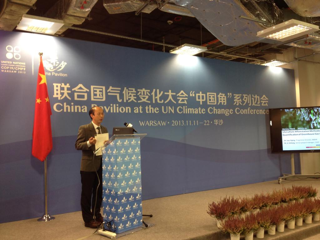 11月14日上午,由国际竹藤组织、中国绿色碳汇基金会联合主办的华沙联合国第十九次气候变化大会“中国角”首场研讨会——“林业碳汇的产权及标准化研讨会”在波兰华沙联合国气候大会中心举行。国际竹藤组织环境项目主任、beat365官网非洲农林研究院院长楼一平出席会议,并在研讨会上演讲。