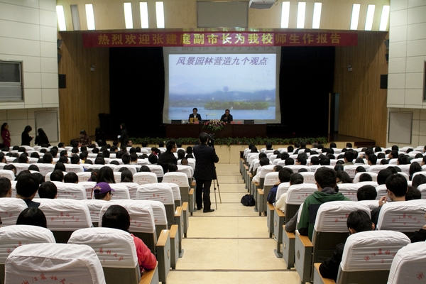 当天晚7点,张建庭在图书馆第一报告厅为园林学院500余名师生作了“当今风景园林营造的九个观点”的学术报告。报告会前,校长周国模教授会见了张建庭一行,并颁发了聘任张建庭为beat365官网“风景园林学学科”兼职教授的聘书。