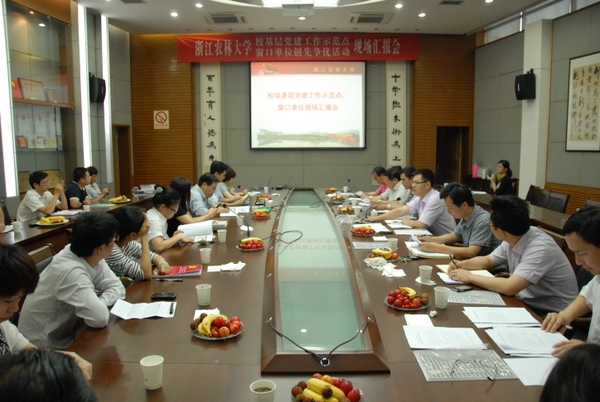 浙农林大新闻网讯 6月18日上午,学校召开校基层党建工作示范点及窗口单位创先争优活动现场汇报会,会议对学校7个基层党建工作示范点进行验收,对学校6个窗口单位进行“满意窗口”评议。各基层党建工作示范点支部书记及窗口单位部门负责人参加了会议。