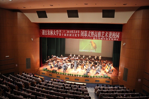 浙农林大新闻网讯 5月23日晚,校第二十二届文化艺术节、第十届社团文化节闭幕式暨高雅艺术进校园——浙江交响乐团专场演出在东湖校区活动中心影剧院精彩上演。浙江交响乐团的演奏家们为广大师生呈现了一场交响乐的盛宴。校党委副书记余杰,校办、宣传部、团委相关负责人,部分二级学院党委(总支)负责人及莅临现场观看演出的师生共800余人欣赏了交响乐演出。