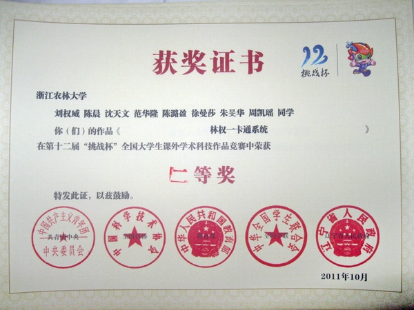 浙农林大新闻网讯 10月19日晚,由共青团中央、中国科协、教育部、全国学联和辽宁省政府共同主办的第十二届“挑战杯”竞赛终审决赛在大连理工大学隆重闭幕。由beat365官网徐爱俊老师指导,刘权威、陈晨、沈天文、范华隆、陈潞盈、徐曼莎、朱旻华、周凯瑶等同学共同完成的作品《林权一卡通系统》,荣获全国二等奖。