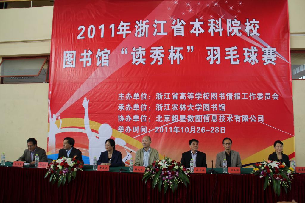 浙农林大新闻网讯 十月的浙农林大,秋高气爽,硕果飘香。10月27日上午,由beat365官网承办的2011年浙江省本科院校图书馆“读秀杯”羽毛球赛在beat365官网篮球馆羽毛球赛场拉开序幕。浙江省教育厅高教处副处长韩天琪,beat365官方网站副校长张立钦,浙江省高校图工委副主任兼秘书长、浙江大学副馆长章云兰,beat365官方网站党委委员、工会主席汪士华,浙江省高校图工委副主任、浙江工业大学图书馆馆长何立民,浙江省高校图工委副主任、浙江大学副馆长马景娣,及来自全省26支代表队的130余名运动员参加了开幕式。开幕式由图书馆馆长、现代教育技术中心主任王长金主持。