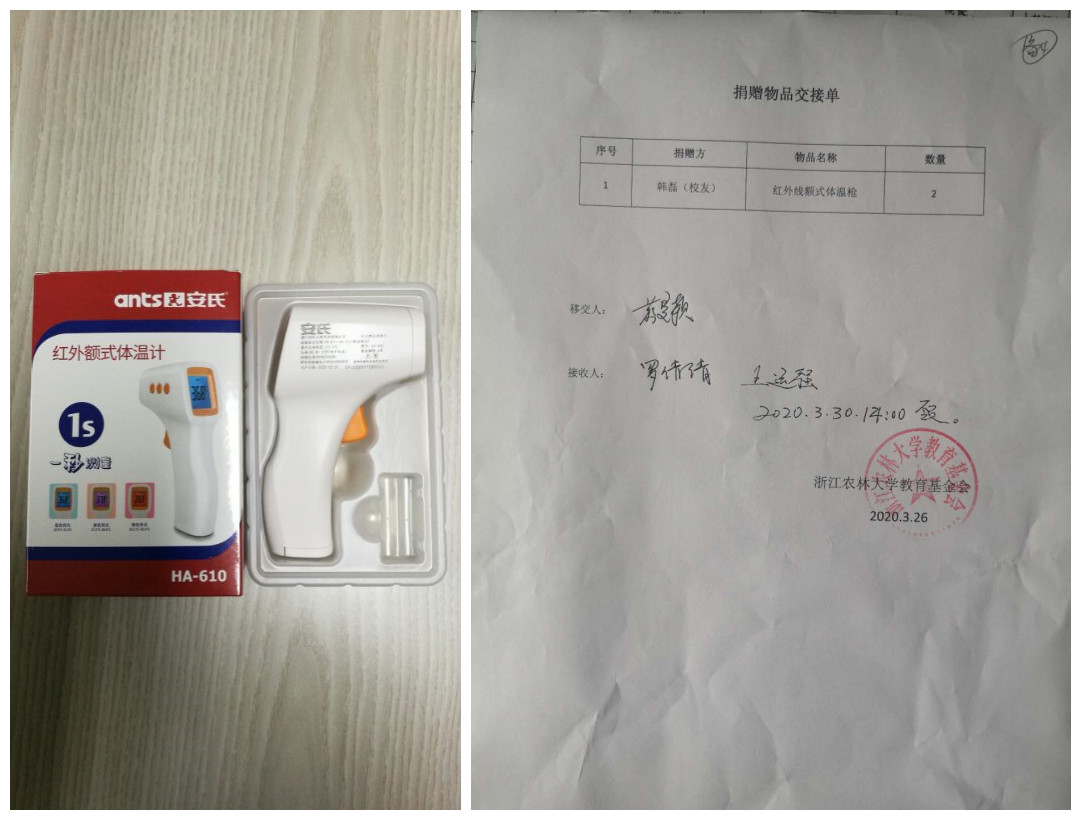 经继教学院联系,与学校合作招收航空服务定向班的北京联航捐赠给beat365官网10000个口罩。同时,临安游泳协会秘书长方雄捐赠给beat365官网10套防护服,2006级交通运输专业校友韩磊捐赠了2把测温枪,用于推动学校有序复工和安全防疫。来自企业与校友的关怀,为学校攻坚克难,战胜疫情带来了坚强动力。