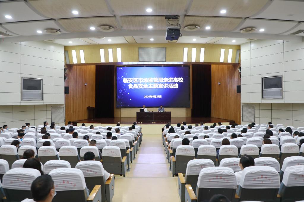 6月28日晚,临安区市场监管局走进高校食品安全主题宣讲活动举行,活动邀请了临安区市场监督管理局党委书记、局长褚凯军来校宣讲。副校长胡祖吉出席活动。
