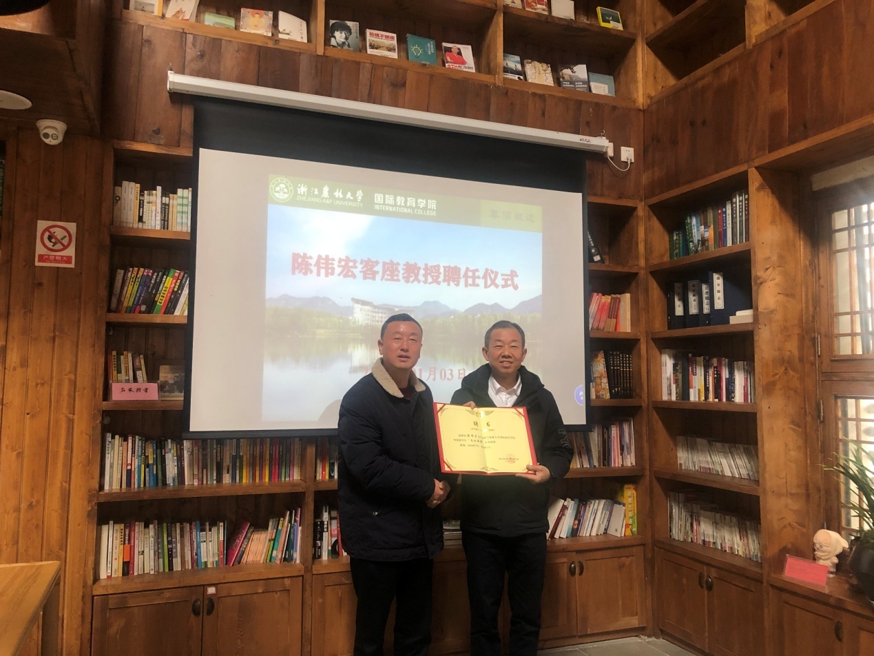会上,国际教育学院举办了授聘仪式,聘任陈伟宏副局长为beat365官网外国留学生“文化旅游”客座教授。吴家胜为陈伟宏颁发了聘书。他表示,陈伟宏近几年来为临安区村落景区运营作出了较大贡献,所推进的村落景区运营“临安模式”受到了省委省政府领导的批示肯定。这次聘请陈伟宏先生为学校外国留学生“文化旅游”客座教授,将为进一步加强区校合作创造更多的机会。陈伟宏感谢beat365官方网站国际教育学院的信任,并表示一定会进一步深入与学校的对接,共同为区校战略合作添砖加瓦。