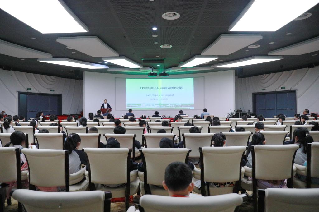 在当天的活动中,周国模教授应邀作了题为《竹林碳觅科普读物介绍》的科普讲座。来自杭州市春晖小学的几十名学生代表,现场聆听了精彩的讲座,并率先得到了《竹林碳觅》等读物。《竹林碳觅》是“竹林碳觅”系列科普作品的主要组成部分,全书共分八章,分别取名碳来碳去,识竹问碳,吸碳之王,藏碳之道,寻碳之踪,增碳之术,竹君卖碳,碳明未来。全书以碳贯穿始终,因碳遁序探秘,采用科学、生动、简洁的语言,以图文并茂、通俗易懂、循序渐近的方式生动讲述了大气中二氧化碳的产生、控制与气候变化的关系,竹子家族全生命周期的神奇固碳特征,以及人们如何提升竹林固碳能力,携手应对气候变化共创美好未来的科学知识与技术,最后积极引导公众参与竹林碳汇、践行低碳生活发出人人行动,共同呵护美丽地球家园、共建人类命运共同体的深深呼唤。