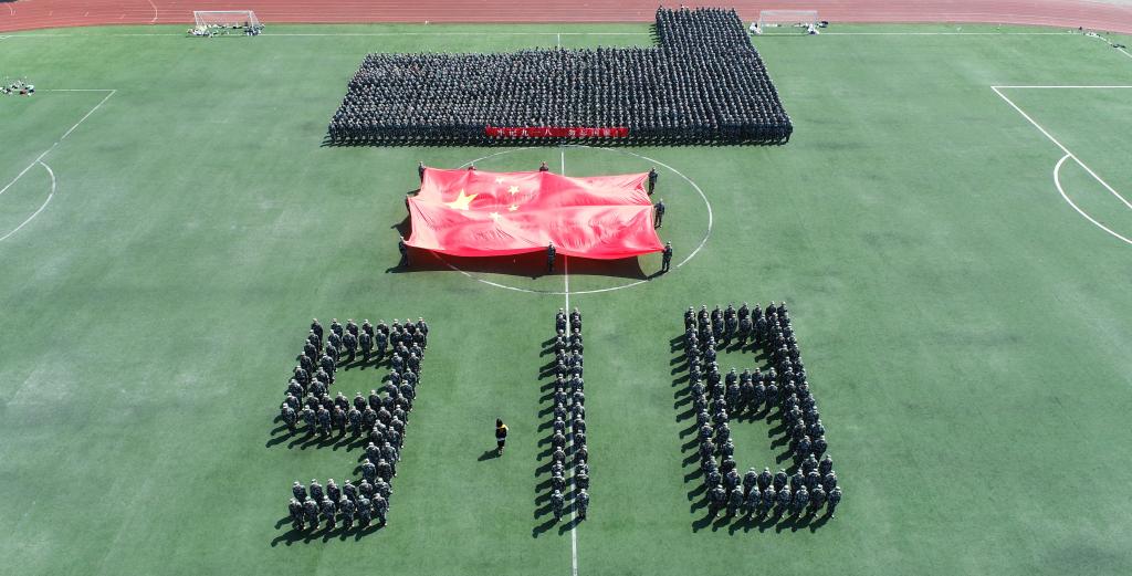 9月18日,是“九一八”事变90周年纪念日,学校组织参加军训的新生开展了纪念“九一八”爱国主义教育活动。数千名师生在B区操场摆出“9.18”数字图案,高喊爱国誓词,托起巨幅五星红旗深情高歌《我和我的祖国》等爱国主义歌曲。