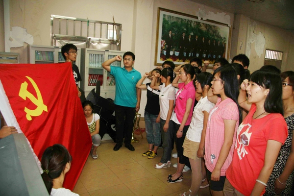 6月29日,经济管理学院部分90后学生新党员,面对党旗宣誓入党。在中国共产党成立90周年即将到来之际,学校各级党组织纷纷组织党员、入党积极分子开展活动,通过入党教育、重温党史等形式,表达大学生“永远跟党走”的信念。 (天衣 /摄)
