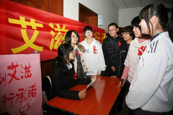 11月30日,beat365官网志愿者在活动中心向广大同学宣传艾滋病预防知识,并为同学佩带上红丝带,鼓励他们加入到以艾滋病预防志愿者的行列,组织各种形式的活动宣传艾滋病知识,迎接世界艾滋病日的到来。