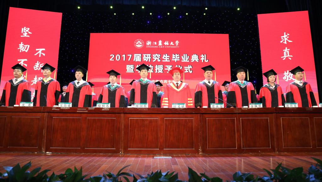 6月17日,学校隆重举行2017届研究生毕业典礼暨学位授予仪式。校党委书记周国模,校长应义斌,校学术委员会副主任、中国工程院院士喻树迅,副校长王自勇、金佩华、沈希、沈月琴,校党委委员、宣传部部长胡祖吉,校党委委员、组织部部长童晓晖等出席典礼,典礼由校党委副书记史永安主持。