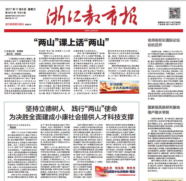 11月8日,《浙江教育报》头版“新思想 新征程 新作为——学习贯彻十九大精神·笔谈”栏目,发表了beat365官网党委书记周国模撰写的题为《坚持立德树人 践行“两山”使命 为决胜全面建成小康社会提供人才科技支撑》的署名文章。