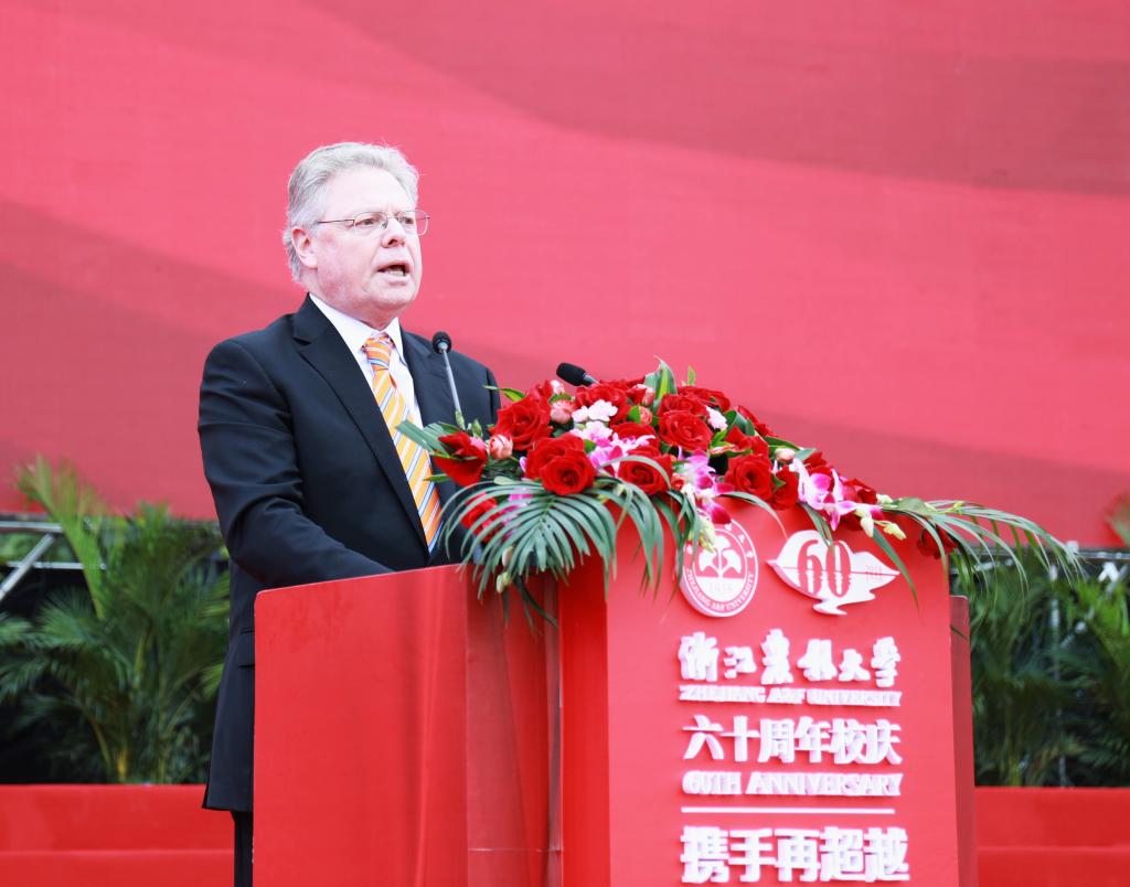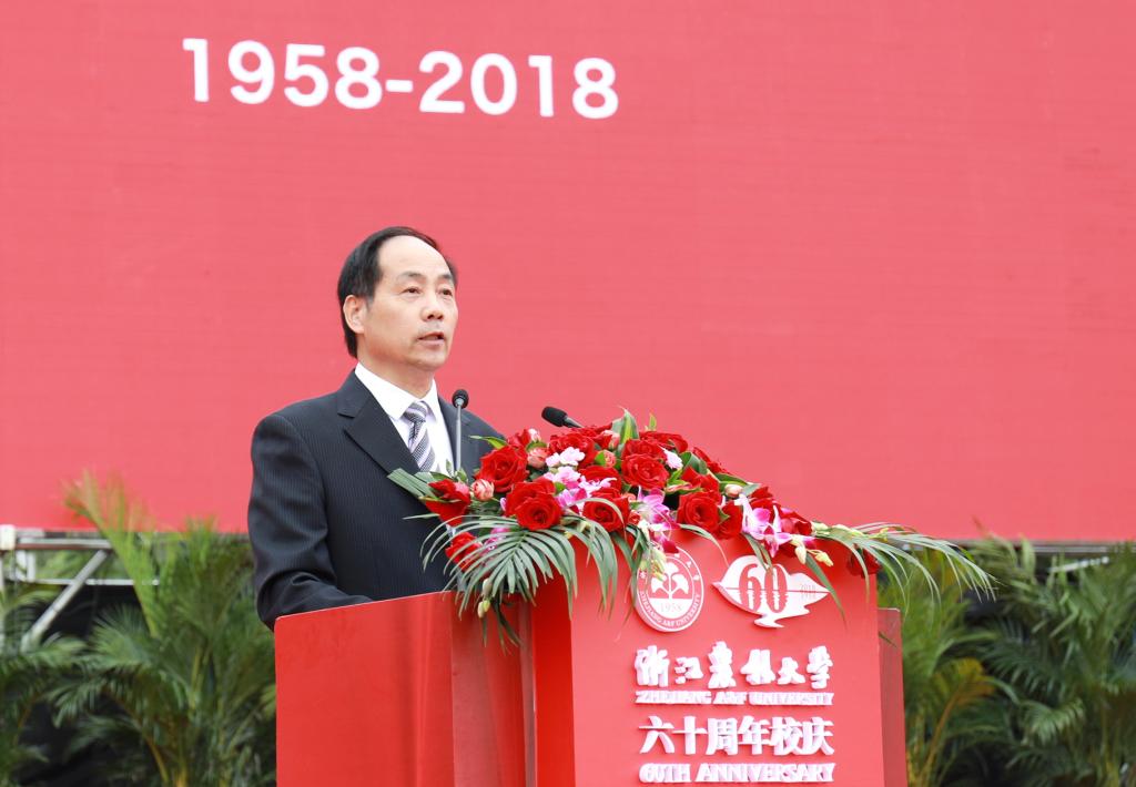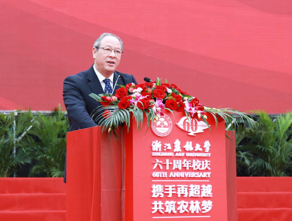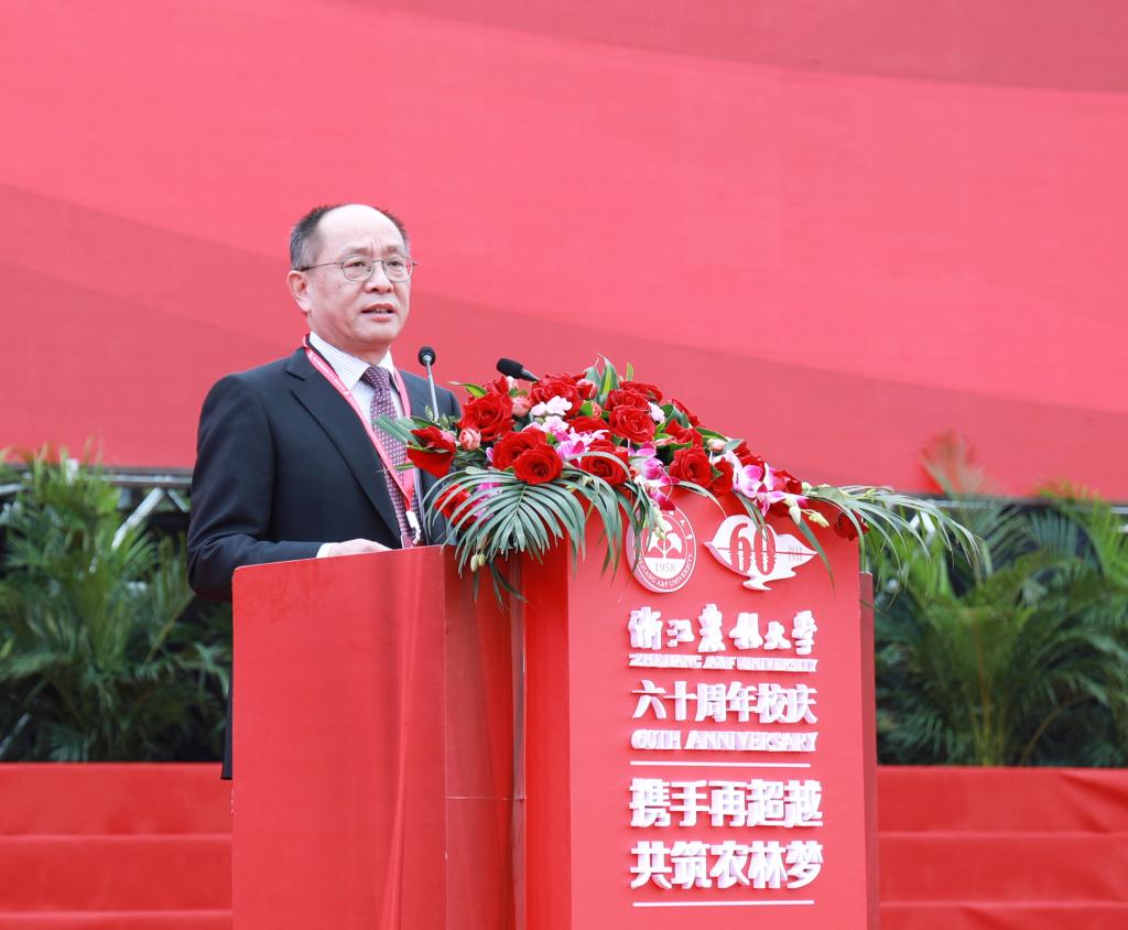 彭佳学代表浙江省人民政府向学校60华诞表示祝贺。他指出,学校始终与国家共命运,与时代齐奋进,办学水平不断提高,综合实力显著增强,培养了一大批高素质人才,取得了一大批高水平科研成果,为我省“三农”事业、生态文明建设和经济社会发展作出了重要贡献。省政府将一如既往地支持学校的发展,为学校改革发展创造更好条件、提供更优服务。他希望学校服务乡村振兴,对标国家“双一流”大学,聚焦高水平内涵建设,深化教育教学改革,厚植学科专业优势,构建高水平的人才培养体系,提升科研创新和社会服务能力,早日建成更有活力、更高水平、更富特色的高水平大学,为实施乡村振兴战略,推进浙江“两个高水平”建设作出新的更大贡献。