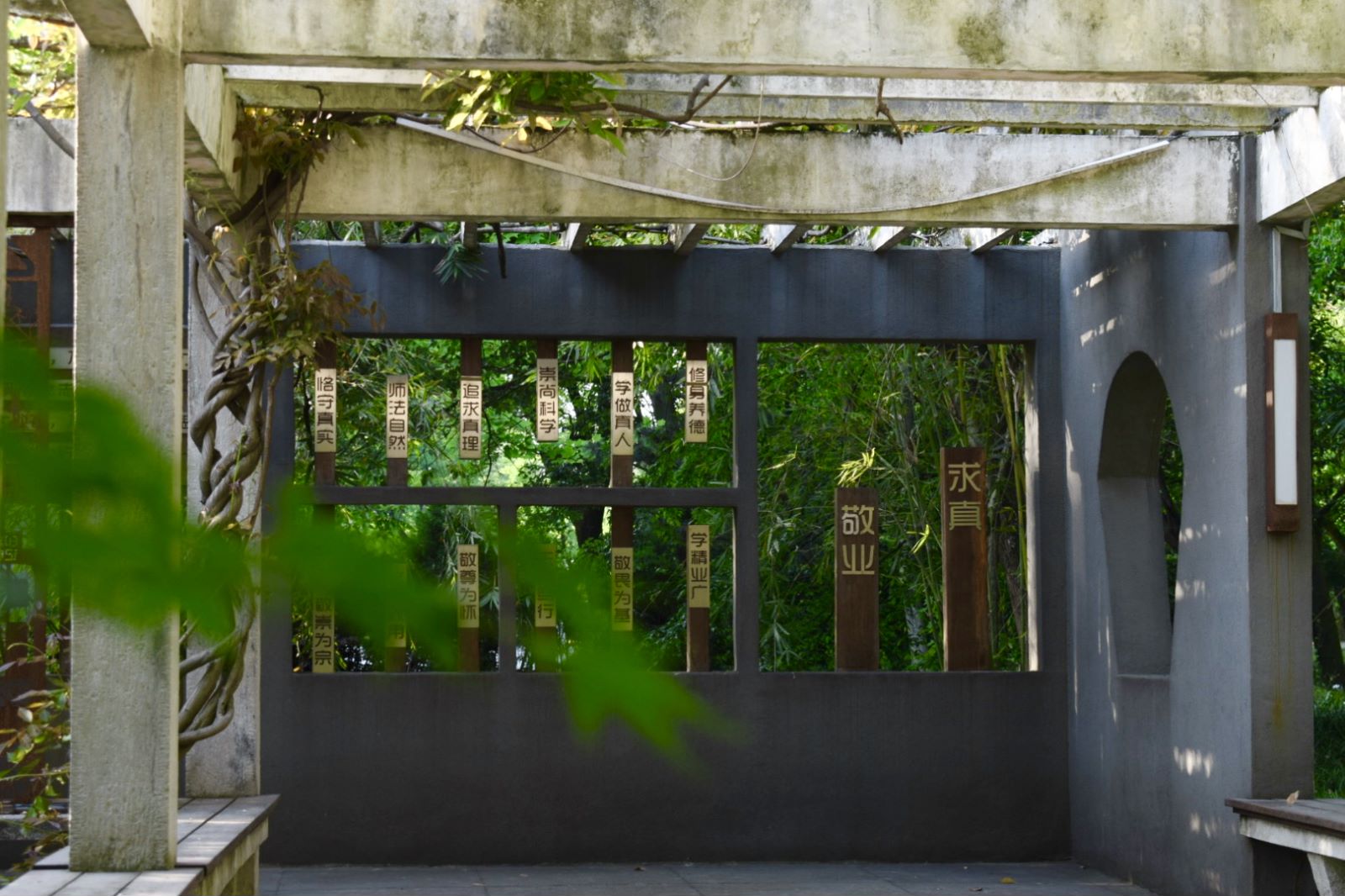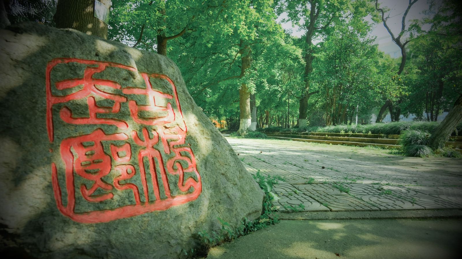 厚厚的枝条争相蔓延在老校印记,阳光从树枝间筛下,地上光影斑斓,这是初夏的讯息;漫步古枫走廊,郁郁葱葱的树木静静伫立,阳光洒落,树叶染上一层翠绿宛如新生,满眼生机。