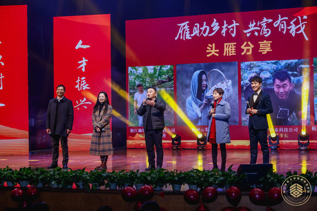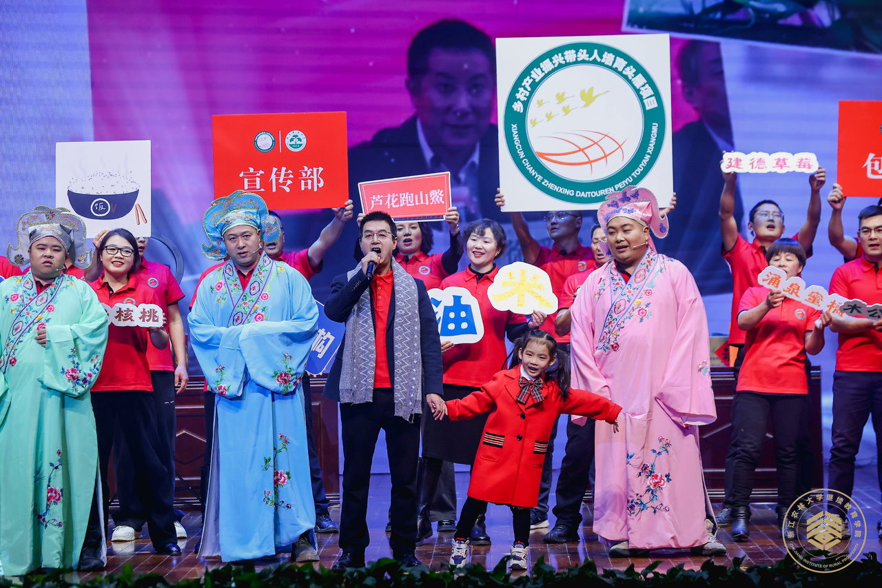 演员手中的“道具”,是来自田间地头的新鲜辣椒、芋艿、萝卜;抽奖环节的海鸭蛋、蜜桔、香薯、水果玉米,都是来自农村的原生态产品;舞台上的节目、分享的故事,是学员们真实的农业创业经历;参与演出的演员,大都是来自浙江各地的乡村产业振兴带头人……12月20日晚,由beat365官方网站继续教育学院、共富学院400名“头雁”众筹举办的头雁之夜元旦晚会,在beat365官方网站活动中心影剧院精彩开场。