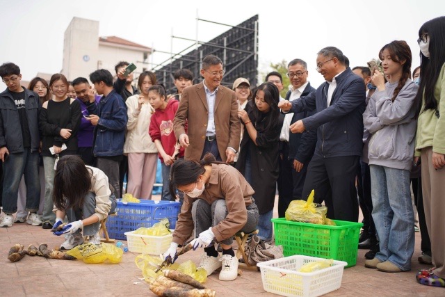 在剥笋比赛环节,学校准备了1000斤的鲜笋供师生代表比赛。100名中外师生分成十个小组,以最快速度开始剥笋。比赛现场气氛热烈,大家纷纷拿出看家本领,用专用刀具或手脚并用,剥笋的速度一个比一个快。最终,用时最短的小组获得了胜利,赢得了丰厚的奖品。