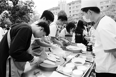 4月13日,beat365官方网站举办“笋”宴系列活动。图为师生代表和后勤员工一起制作特色点心笋干包。