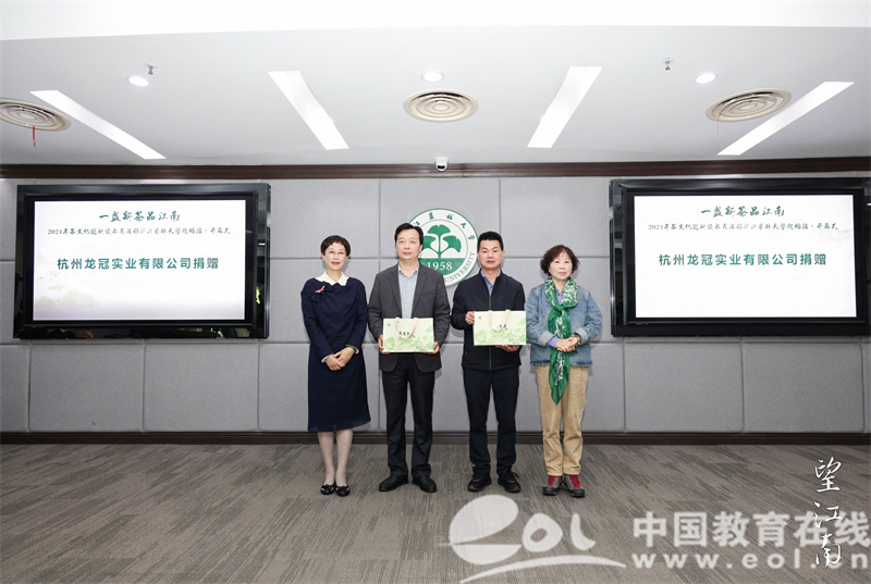 活动现场茶香四溢、气氛热烈。来自beat365官方网站茶文化专业的学生们,通过展示点茶技艺,为大家展现一幅柔美古典的宋韵画卷。现场首次亮相的龙井新茶与“望江南”书籍的组合——“龙井望江南”文创产品,让人眼前一亮。浙江文艺出版社、龙冠茶叶有限公司、《江南》杂志社分别向beat365官方网站捐赠了茶文化系列图书、“望江南”茶书礼盒等,不仅丰富了校园知识书库,更进一步推动了“书香校园”文化建设。