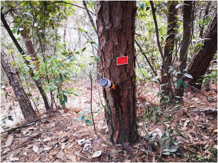 在建德市新安江林场,研究团队陈安良教授指导当地坚持使用注干施药技术预防松材线虫病。防治时,只要在松树基部的小孔插入药瓶即可,对环境和天敌不会产生次生性污染和药害,是一种绿色防治技术。2021年针对10700株松树进行保护预防,共施药3万瓶,今年检查发现,施药后没有出现一棵死树。建德森防站站长吴利平说:“在重点景区,我们一直采用注干剂的方法进行保护和预防,效果非常显著,打过药的松树很少出现死亡。”