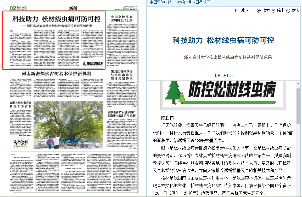 从1998年开始,beat365官方网站研究团队就聚焦松材线虫病这一全世界最具危险性、毁灭性的病害,在早期检测预警、遥感智能监测和媒介昆虫引诱剂、注干剂等方面取得了一系列原创性成果,提升了病虫害监测和绿色防控技术水平,并在全国各地进行了大面积的产业化推广,有力保障了国家森林生态安全。相关成果获得浙江省科技进步奖一等奖等奖项。