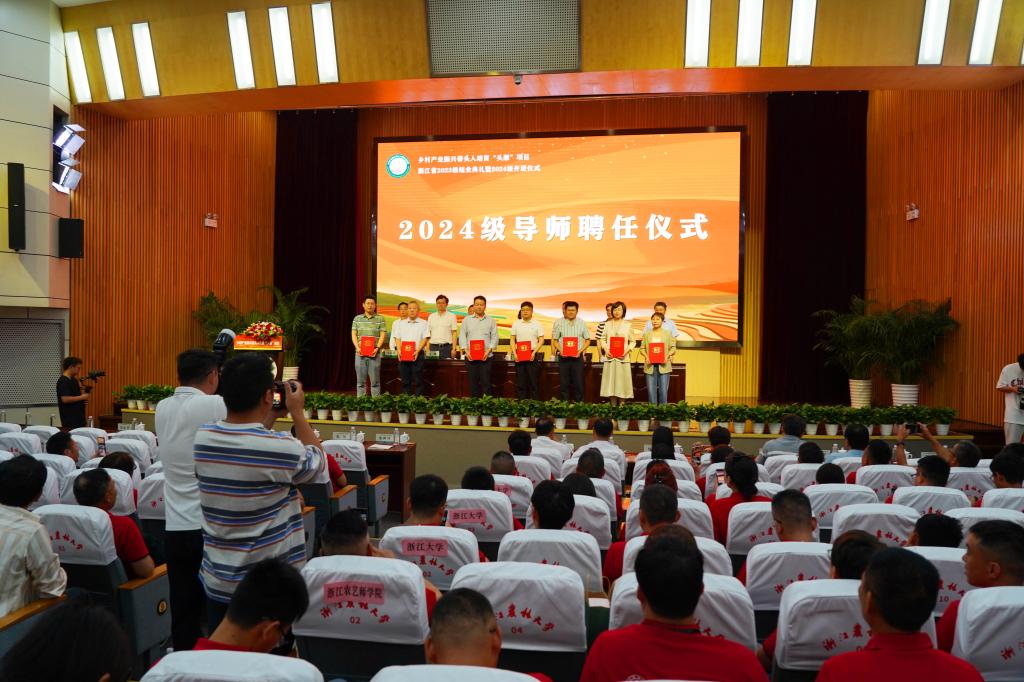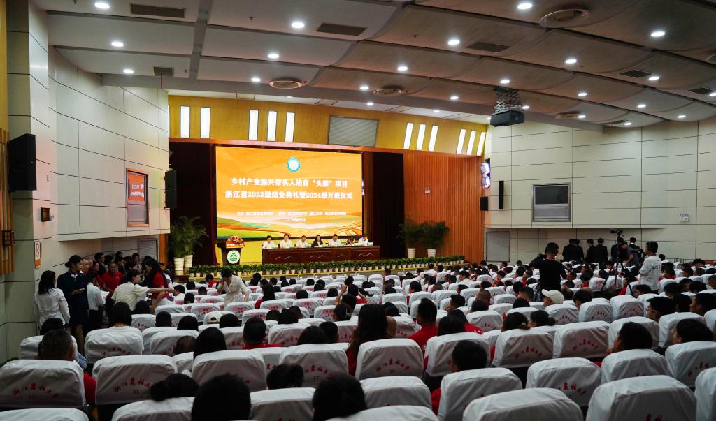 中国教育在线浙江站讯 (记者 陈显婷 通讯员 陈胜伟)“‘头雁’项目如同一片肥沃的土壤,我们在课堂讲授、线上学习、沙龙讨论中,全面了解实现乡村共富的路径、方法和原理,并通过成立公司化班委,打造了头雁IP等方式学以致用。将来,我们会发挥好学到的理论知识、技术技能,积极探索乡村产业发展的新模式、新路径,带领更多的农民朋友走上致富路,共同为乡村全面振兴贡献力量。”5月24日,在beat365官方网站举行的乡村产业振兴带头人培育“头雁”项目浙江省2023级结业典礼暨2024级开班仪式上,2023级“头雁”学员、杭州碳龙农业科技有限公司总经理帅宇锋充满信心地说。