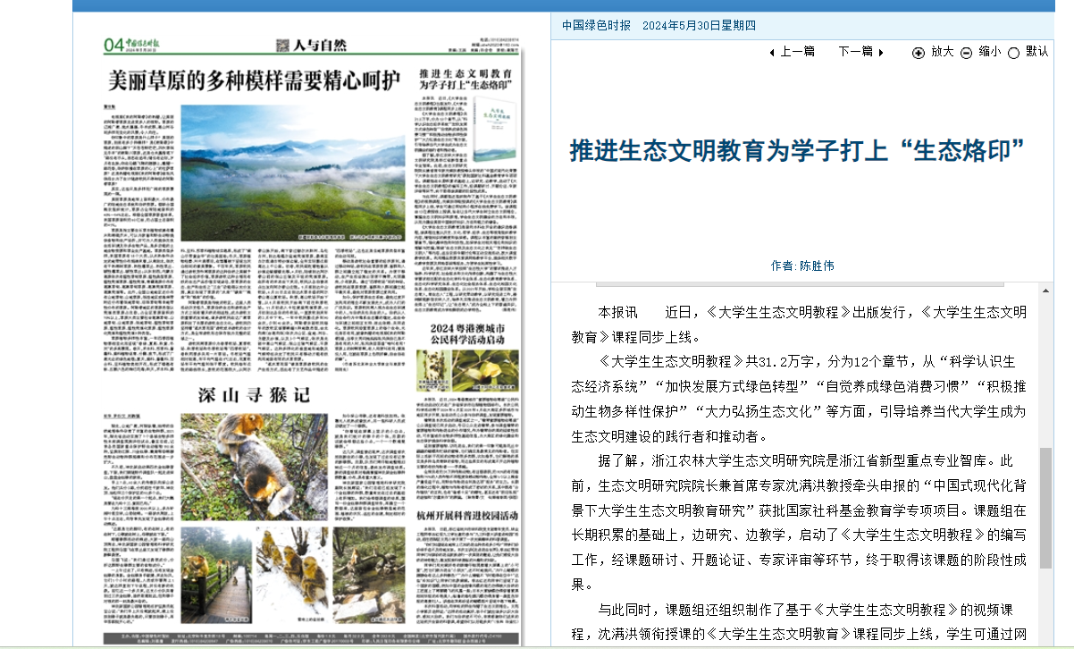 近日,《大学生生态文明教程》出版发行,《大学生生态文明教育》课程同步上线。
