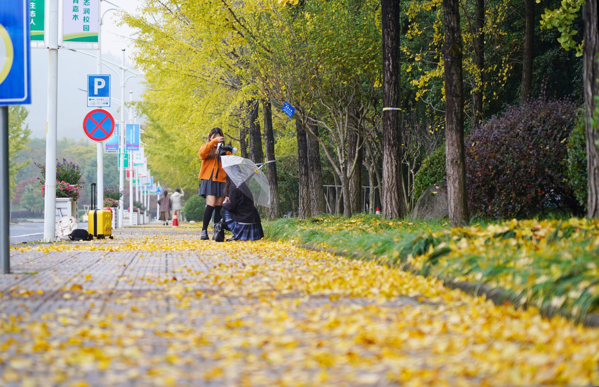 每年这时候,络绎不绝的师生纷纷结伴前往银杏大道,或欣赏景色,或拍照打卡,不少“拍友”还带着单反相机、无人机来拍摄。金黄色的绝美银杏风景照,成为了师生朋友圈的秋季爆款和主旋律,也让“银杏大道”成为众多新媒体平台上的网红打卡地。
