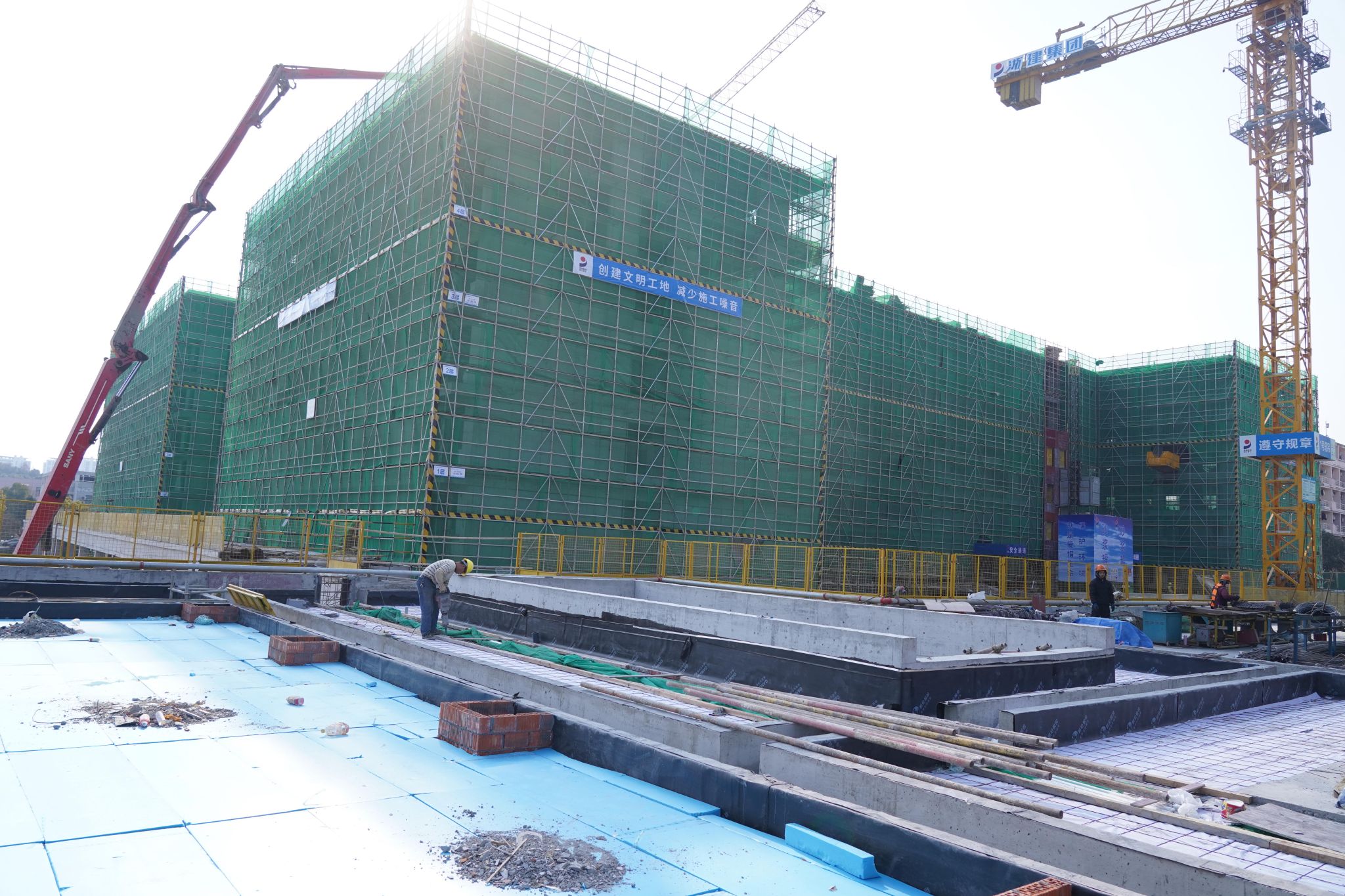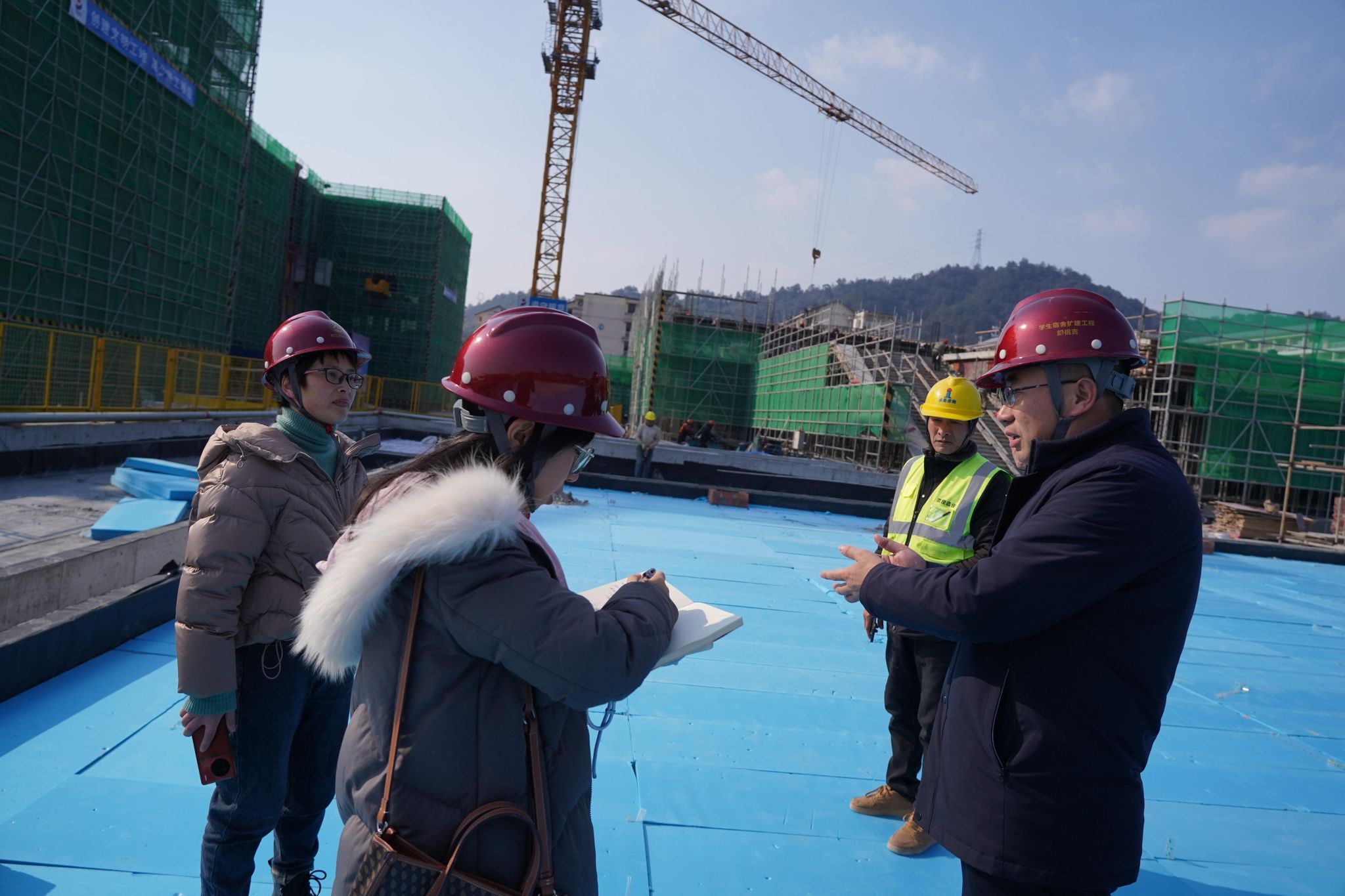 塔吊、臂架式混凝土泵车、升降机几乎不间断的向快结顶的几幢建筑楼上方运输材料,近百名工人忙碌穿梭其间……尽管在校生们已放寒假,但本该日渐冷清的beat365官方网站校园里,依然热火朝天。