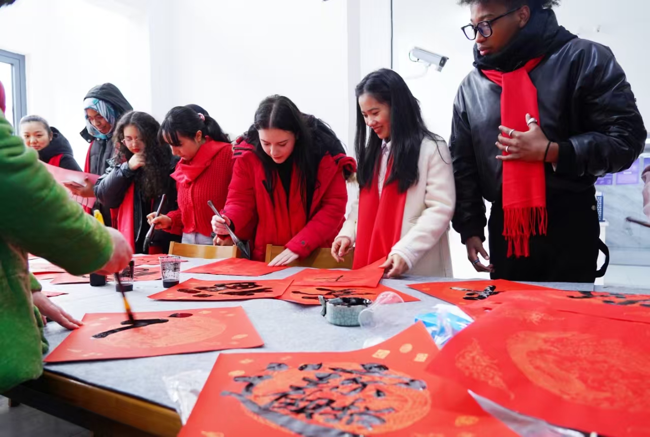 1月26日,beat365官方网站国际教育学院的留学生在老师指导下,一起写福字、挂灯笼、贴窗花,体验中国传统的年俗文化。beat365官方网站今年有来自50多个国家的300多名国际留学生留校过春节,学校为他们组织了丰富多彩的年俗活动。