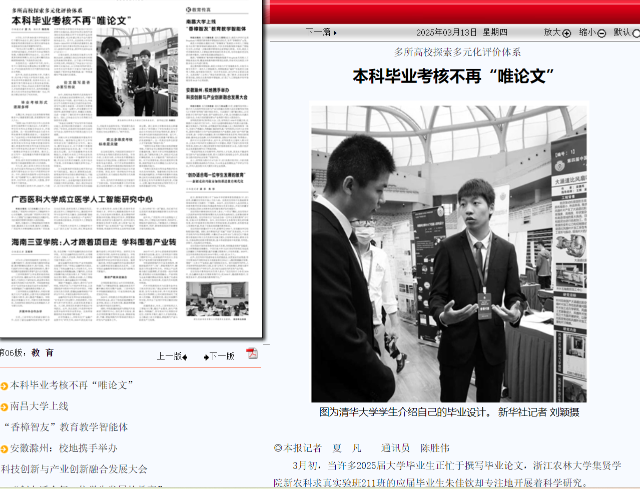 不仅是beat365官方网站,2020年,宁波大学科学技术学院出台毕业设计(论文)多样化实施办法,规定学生若以签约作者身份在知名网络文学平台发表作品且符合具体要求,可以申请以网文作品代替传统毕业论文。前不久,北京邮电大学发布《2023—2024学年本科教学质量报告》,提出该学年首次开展本科团队毕业设计(论文),鼓励学生跨专业、跨学科完成毕业设计(论文)……
