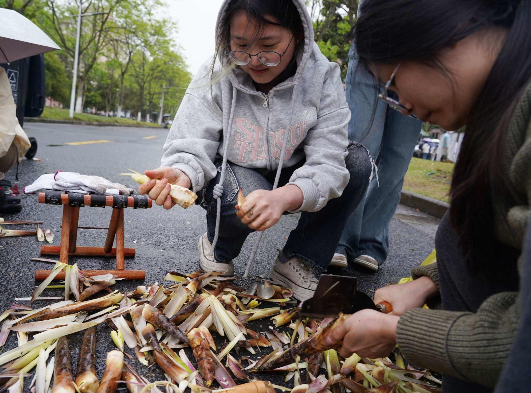 在剥笋比赛的现场,学校早早准备了数百斤的天目雷竹笋供师生代表现场比赛。60名中外师生每两人为一个小组,他们以最快的时间开始剥笋。剥出的笋,就是他们的奖品,剥笋的时间越短,奖品也越丰厚。比赛的指令已发出,大家有的拿着专用刀具,有的手脚并用,剥笋的速度一个比一个快。