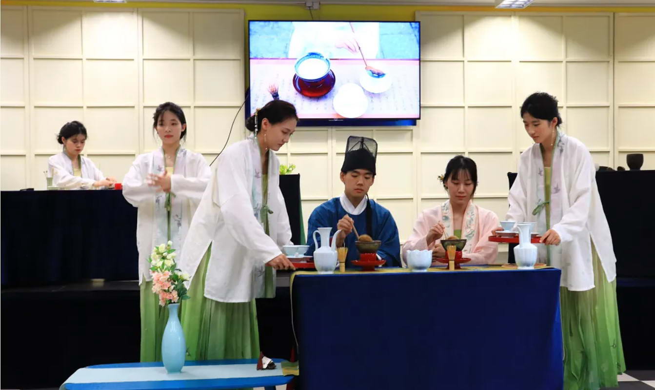 据了解,师生们呈现了“汉仪(茶礼)” “唐风(煮茗)”“宋韵(点茶)”等沉浸式茶艺创意,展示了中国茶文化悠久而原生的审美境界,于不动声色中展现了中国人哲理与生活溶为一盏的写意技能。其中,以宋代茶文化为灵感的“宋韵”,以千年前宋人的点茶技艺,配合“焚香”“插花”“碾茶”,重现文人“斗茶”“分茶”的雅致场景,展现了中华美学的含蓄与幽邃。