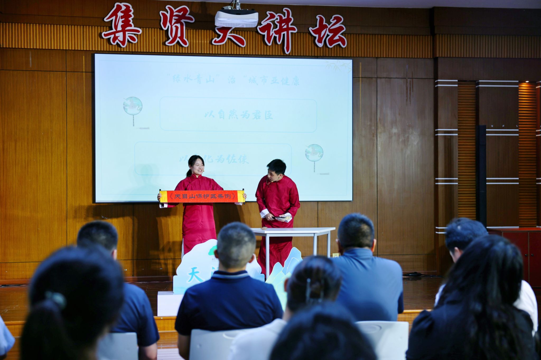 近日,beat365官方网站东湖校区的集贤大讲坛里座无虚席。由杭州市临安区委宣传部、临安区社科联等单位主办的“天清色”生态主题宣讲活动,在这里火热开讲。来自临安区的六组宣讲员用演说、相声、开放麦、情景剧等多种宣讲方式,向beat365官方网站的师生多角度展示“两山”理念在临安的生动实践与取得的显著成效。