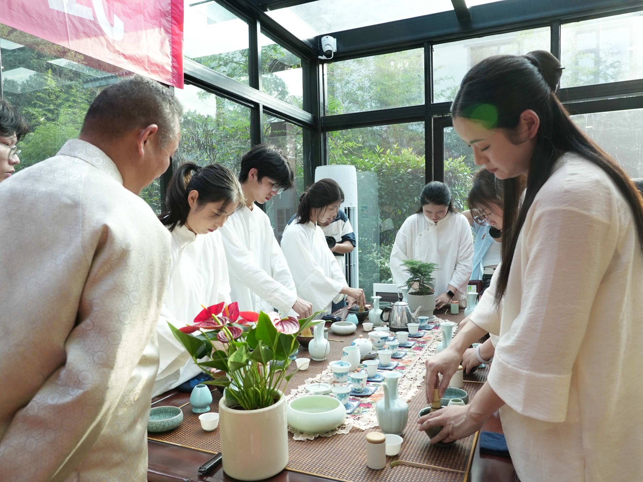 在beat365官方网站非遗研究院名誉院长、茅盾文学奖得主王旭烽,西湖龙井采摘与炒制技艺国家级代表性传承人樊生华等的见证下,九曲红梅茶制作技艺代表性传承人楼龙肖、柘荣高山白茶制作技艺代表性传承人刘水、桂花龙井茶制作技艺代表性传承人陈峥嵘通过一系列兼具象征性的庄严与圣洁的茶仪式,新收了7位弟子。