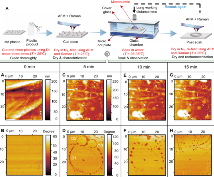 该研究成果解析了典型水环境条件下塑料表面自发形成微气泡过程,并揭示其诱导界面侵蚀驱动微塑料与纳塑料释放机制,为准确评估饮用水及天然水体中微/纳塑料污染的形成过程与控制措施提供了理论支撑。