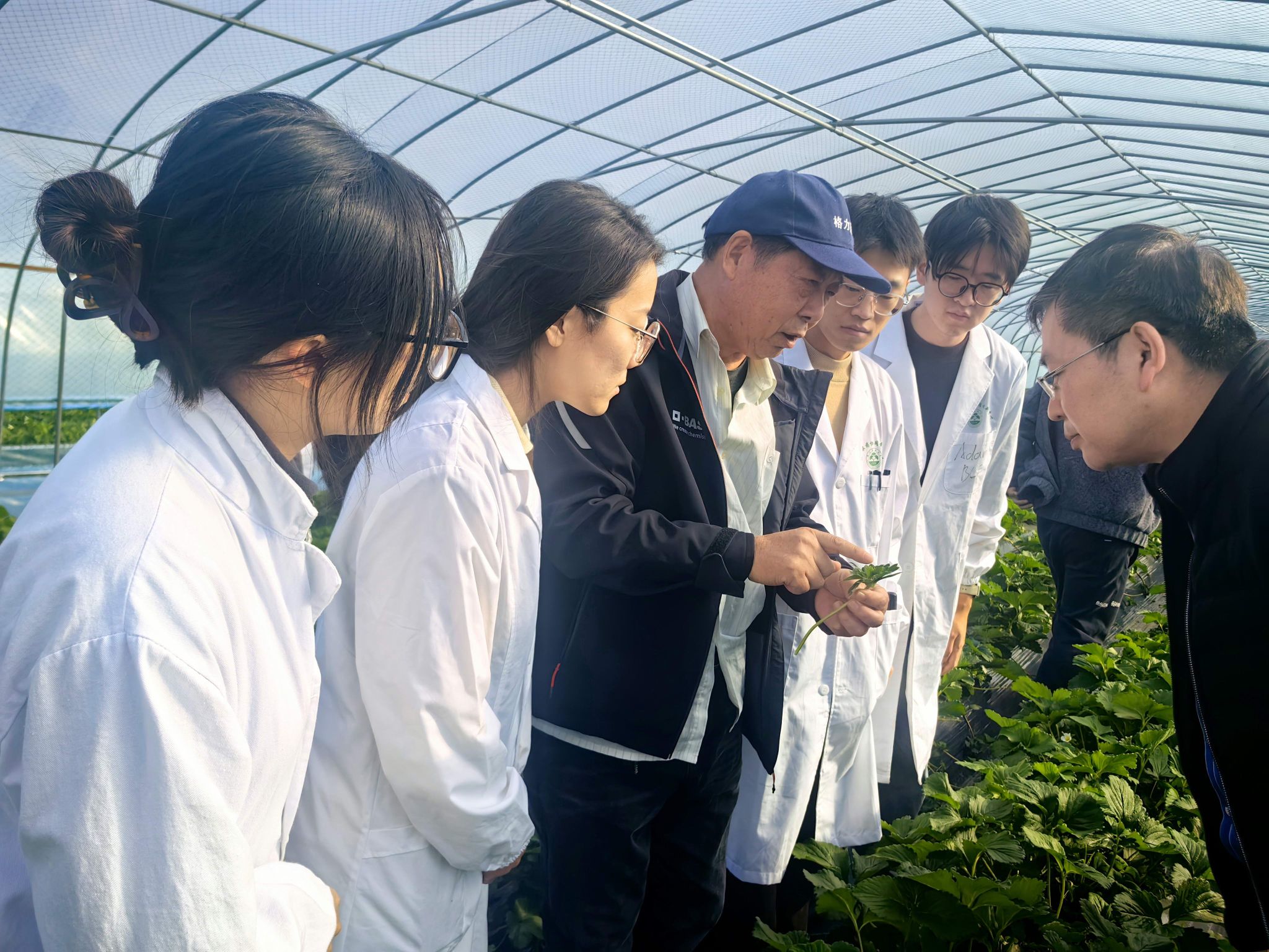 团队成员在草莓田里观察“疫苗”效果 beat365官方网站供图