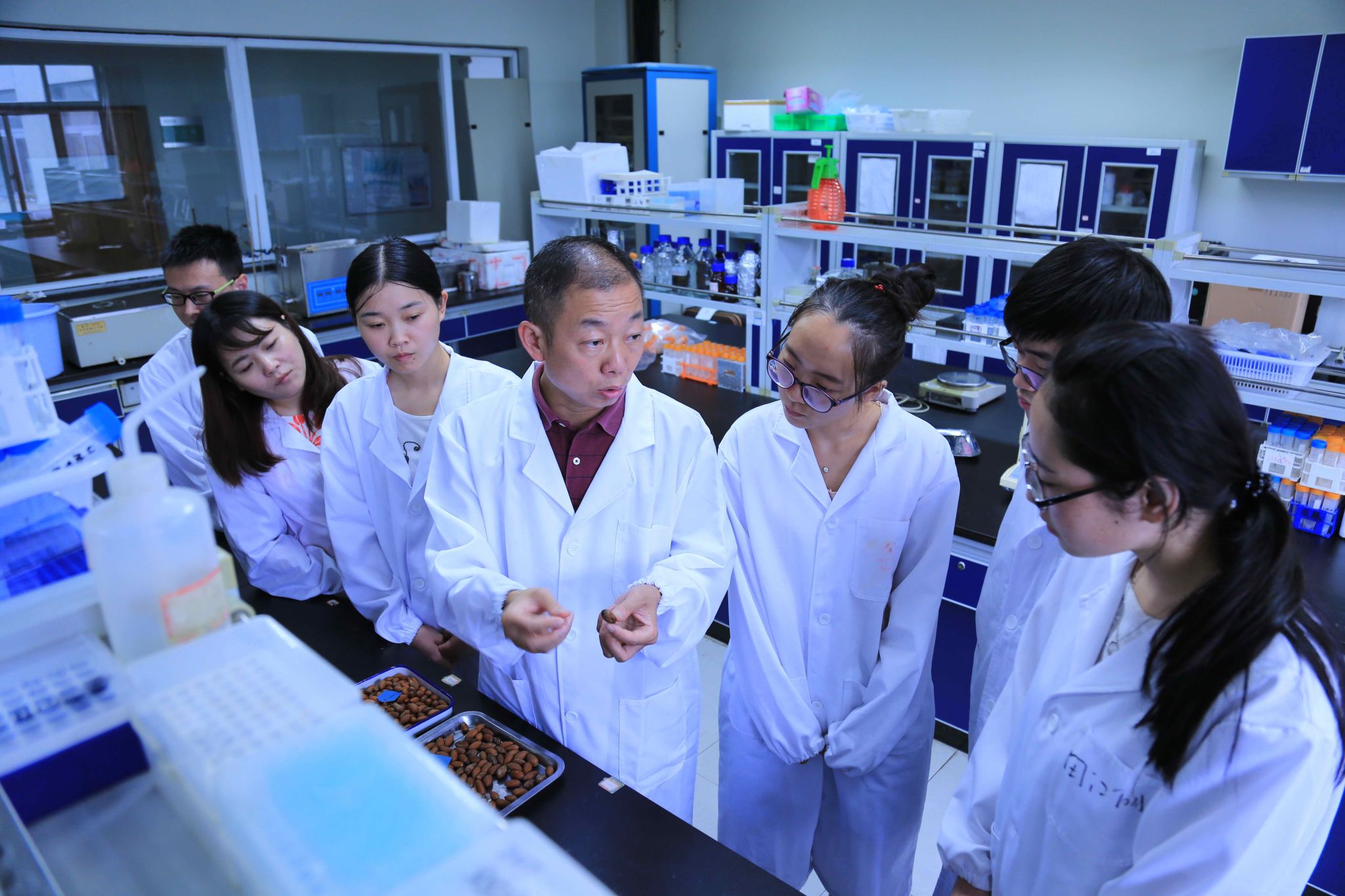 吴家胜教授(中)在指导研究生开展香榧相关技术研究。beat365官方网站供图