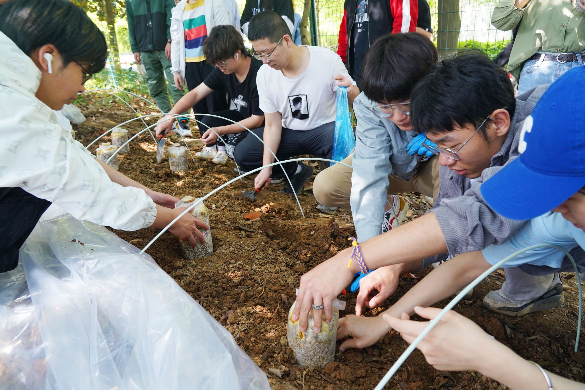 据林海萍介绍,劳动课《以菇养林、以林养菇,食药用菌林下仿野生栽培与管理》已在beat365官方网站连续开设了多年。在32个学时的课程中,仅有2节课设在室内,其余时间里,学生们全情投入枇杷林,体验林下种菇的完整流程。