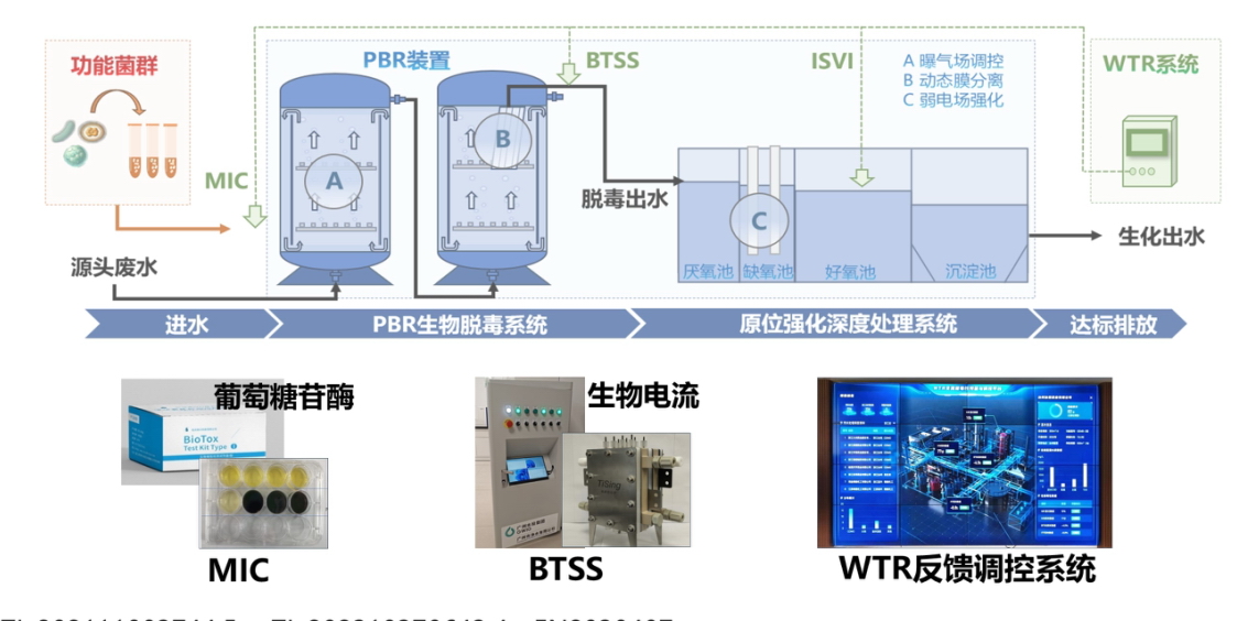 在此基础上,团队研发“前端生物高效解毒、后端生物深度降解”的代谢偶联技术体系,让污染物去除率提升28%~74%,容积负荷达到常规工艺的3.5倍;全流程毒性监控与智能调控系统则保障了系统的稳定运行,毒性预警响应时间小于30分钟,准确率超99%,将因毒性冲击导致的生产事故减少95%以上。