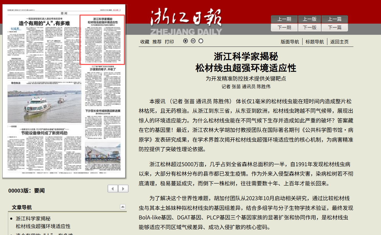据悉,该成果不仅回答了行业长期关注的松材线虫向高纬度高海拔扩散的核心问题,也为后续开发核酸药物、生物农药等精准防控技术提供了关键靶点,对我国乃至全球的松材线虫病防控工作具有重要意义。“基于研究成果,团队目前正在研发针对松材线虫的生物农药,有望改变松树染病后‘一药难求’的全球性难题。”胡加付说。