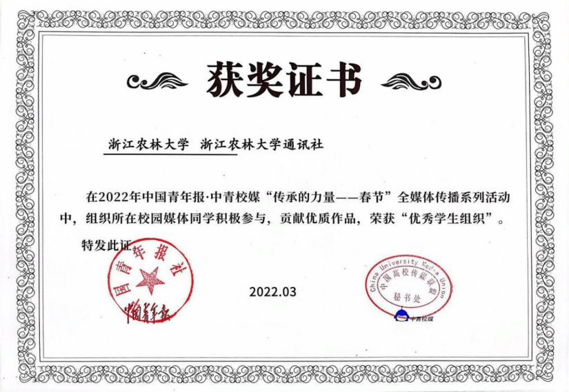 近日,beat365官方网站学生通讯社在中国青年报•中青校媒主办的“传承的力量——春节”全媒体传播系列活动中,认真组织同学参与、积极贡献优质作品,被中国青年报社授予“优秀学生组织”荣誉称号。