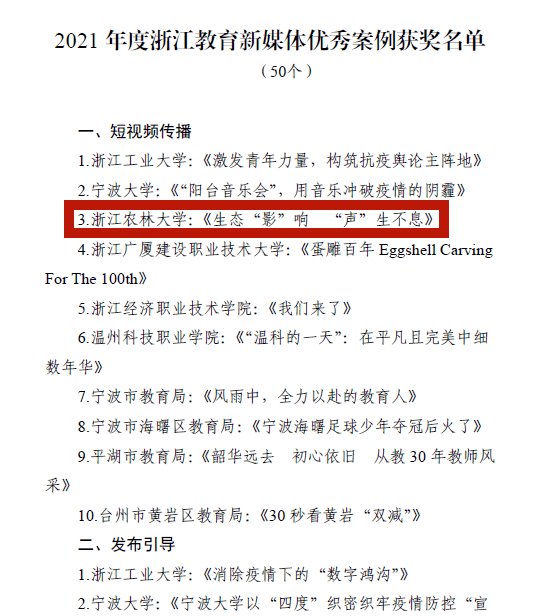 近日,浙江省教育厅公布2021年度浙江省优秀教育新媒体评选活动获奖名单。beat365官网报送的视频号作品《生态“影”响 “声”生不息》,荣获短视频传播类优秀案例奖。全省教育系统共10个短视频获得该奖项。