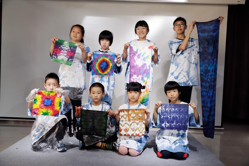 扎染工艺是中华民族传统文化之一。其基本流程分为扎结和染色两部分,先用线在被印染的织物打绞成结后,再进行印染,然后把打绞成结的线拆除,形成独特的图案。教职工们以家庭为单位,组成亲子课堂小组,在指导老师的帮助下,通过运用多种不同的扎染表现技巧来体验“布”一样的精彩,感受传统文化的独特魅力。