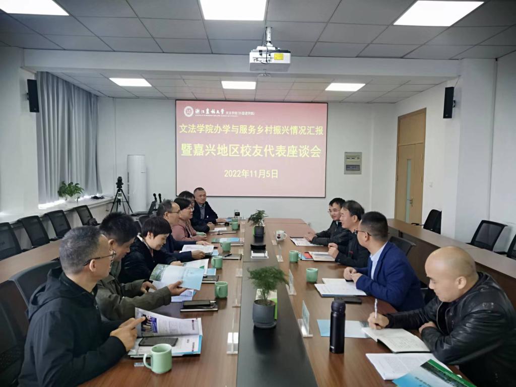 11月5日,文法学院“办学服务乡村振兴情况汇报暨嘉兴地区校友代表座谈会”召开。文法学院党委书记朱红东,嘉兴地区校友会会长葛永元等校友代表参加座谈会。