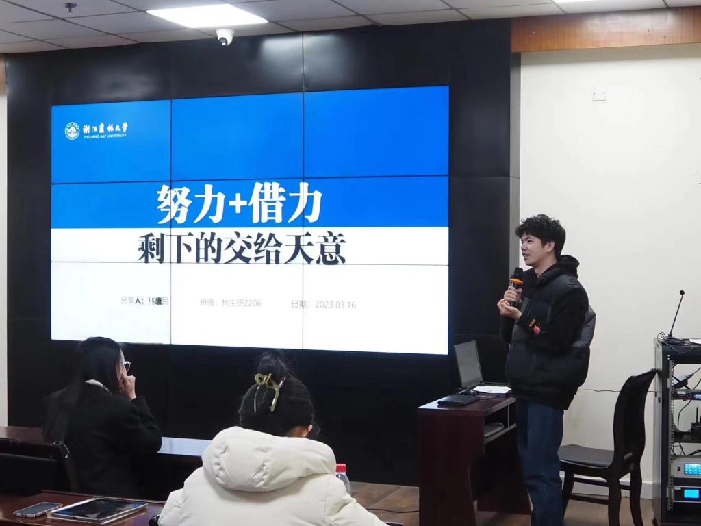 林生院的林康民同学以“努力+借力,剩下的交给天意”为题,从竞赛收获、竞赛渠道、竞赛方法、团队合作及自身感悟等方面向同学们分享了自己参加竞赛的心路历程。
