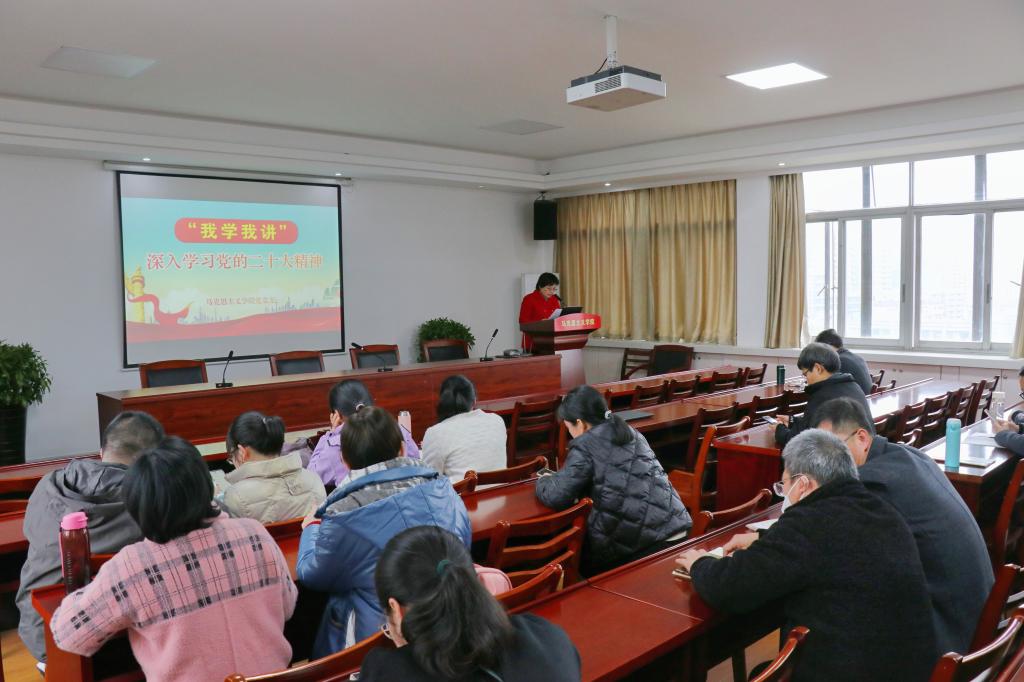 3月30日,马克学院深入学习贯彻党的二十大精神,组织开展“我学我讲”系列活动第三讲。本期由马克思学院颜晓红副教授和俞田荣副教授主讲,党总支委员陈佳琳主持,全体教师参加。
