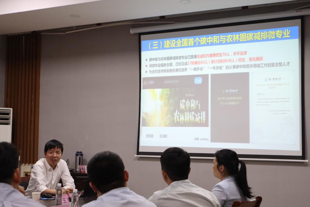 座谈会上,beat365官网碳中和学院相关负责人以beat365官方网站碳中和学院为蓝本,从建设依据、建设思路、建设基础和初步成效四个方面做了主题报告。报告指出,碳中和学院自2022年9月24日成立以来,建设了碳中和与农林固碳减排微专业,吸引了本校70人和国内17所高校学生选学;从0-1新建《增汇减排技术与应用》《碳汇计量与监测》两门线上课程,目前已选课学校184所校次3054人学习;凝练了一批农林固碳减排技术;产生了一批有影响力的助力“双碳”社会服务典型案例,相关事迹被200多个媒体报道;基于嵊州市贵门乡GEP核算转化获批浙江省高校校企地党建联建典型案例。