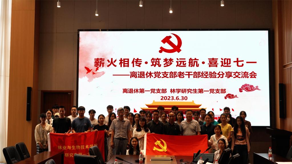 6月30日下午,学校离退休第一党支部与林学研究生第一党支部共同举办“薪火相传·筑梦远航·喜迎七一”老党员经验分享交流会。林生院党委书记郑炳松及相关负责人,离退休第一党支部党员董林根、严逸伦、王学利以及林生院研究生各党支部党员代表和入党积极分子参加此次活动。
