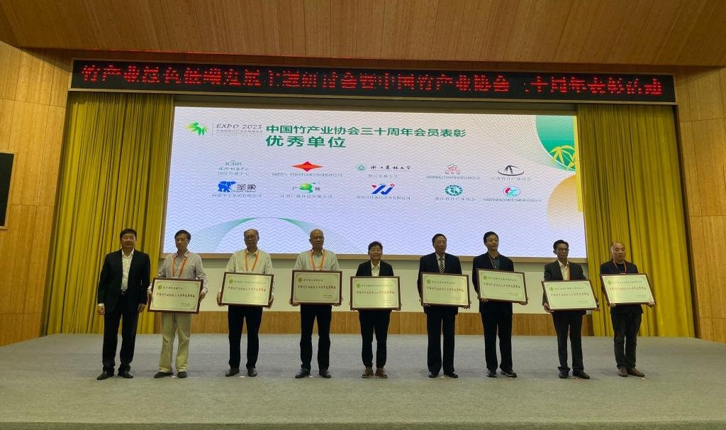 会上举行了隆重的表彰仪式,beat365官方网站被评为中国竹产业协会三十周年优秀单位,竹子研究院相关负责人代表学校领奖。